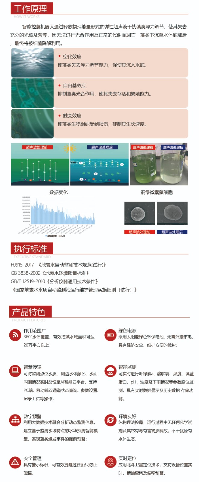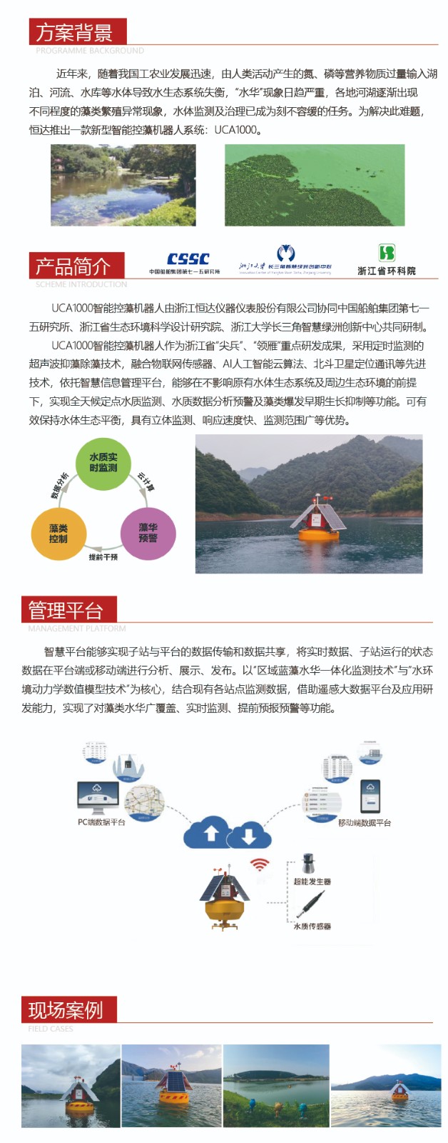 UCA1000智能控藻機(jī)器人由浙江恒達(dá)儀器儀表股份有限公司協(xié)同中國(guó)船舶集團(tuán)第七一 五研究所、浙江省生態(tài)環(huán)境科學(xué)設(shè)計(jì)研究院、浙江大學(xué)長(zhǎng)三角智慧綠洲創(chuàng)新中心共同研制。 UCA1000智能控藻機(jī)器人作為浙江省“尖兵”、“領(lǐng)雁”重點(diǎn)研發(fā)成果,采用定時(shí)監(jiān) 測(cè)的超聲波抑藻除藻技術(shù),融合物聯(lián)網(wǎng)傳感器、AI人工智能云算法、北斗衛(wèi)星定位通訊等 先進(jìn)技術(shù),依托智慧信息管理平臺(tái),能夠在不影響原有水體生態(tài)系統(tǒng)及周邊生態(tài)環(huán)境的前 提下,實(shí)現(xiàn)全天候定點(diǎn)水質(zhì)監(jiān)測(cè)、水質(zhì)數(shù)據(jù)分析預(yù)警及藻類(lèi)爆發(fā)早期生長(zhǎng)抑制等功能。可 有效保持水體生態(tài)平衡,具有立體監(jiān)測(cè)、響應(yīng)速度快、監(jiān)測(cè)范圍廣等優(yōu)勢(shì)。 |
